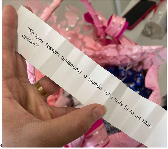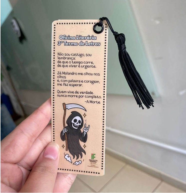 A atividade seguiu a metodologia de letramento literário proposta por Rildo Cosson, com etapas de motivação, leitura e interpretação crítica. Logo na recepção, os convidados foram surpreendidos por uma provocação criativa: “Você prefere um bilhete malandragem ou uma doce transformação?”. A escolha definia os grupos de discussão e introduzia os temas centrais da oficina. A maioria optou pelo “bilhete malandragem”, motivada pela curiosidade despertada pela expressão. Após a interação inicial, quando vários pontos de vista foram expostos, os alunos apresentaram o conto A Quase Morte de Zé Malandro, de Ricardo Azevedo, por meio de uma leitura expressiva e envolvente. Na narrativa, Zé Malandro, personagem indolente e irreverente, enfrenta a Morte e, com astúcia, consegue ludibriá-la para escapar do fim.