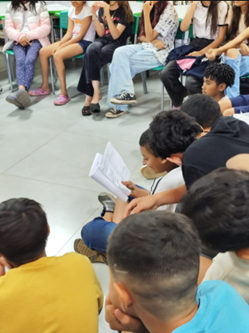 O diálogo foi marcado pela curiosidade e envolvimento dos estudantes, que expressaram encantamento em vivenciar a leitura de forma tão sensível e dinâmica.