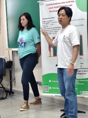 Foram recepcionados pelos licenciandos do primeiro termo, Bruno Machado Ribeiro, Fernanda Porcel da Silva e Vinícius Sakaguti Takamoto os quais apresentaram os principais aspectos do curso, como duração e disciplinas estudadas. Mas a formação de professores e a possibilidade de trabalhar como revisores e tradutores foi o que mais se destacou. Os estudantes de Letras mostraram livros estrangeiros(do inglês, espanhol e até norueguês) traduzidos para o português e informaram os nomes dos respectivos tradutores.