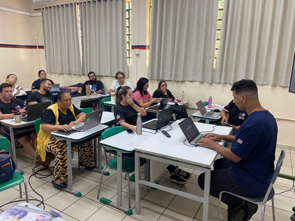 Os discentes promoveram oficinas voltadas aos alunos do Ensino Fundamental II, com ênfase em conceitos de informática básica, e aos professores, com o objetivo de oferecer capacitação profissional na área de inteligência artificial.