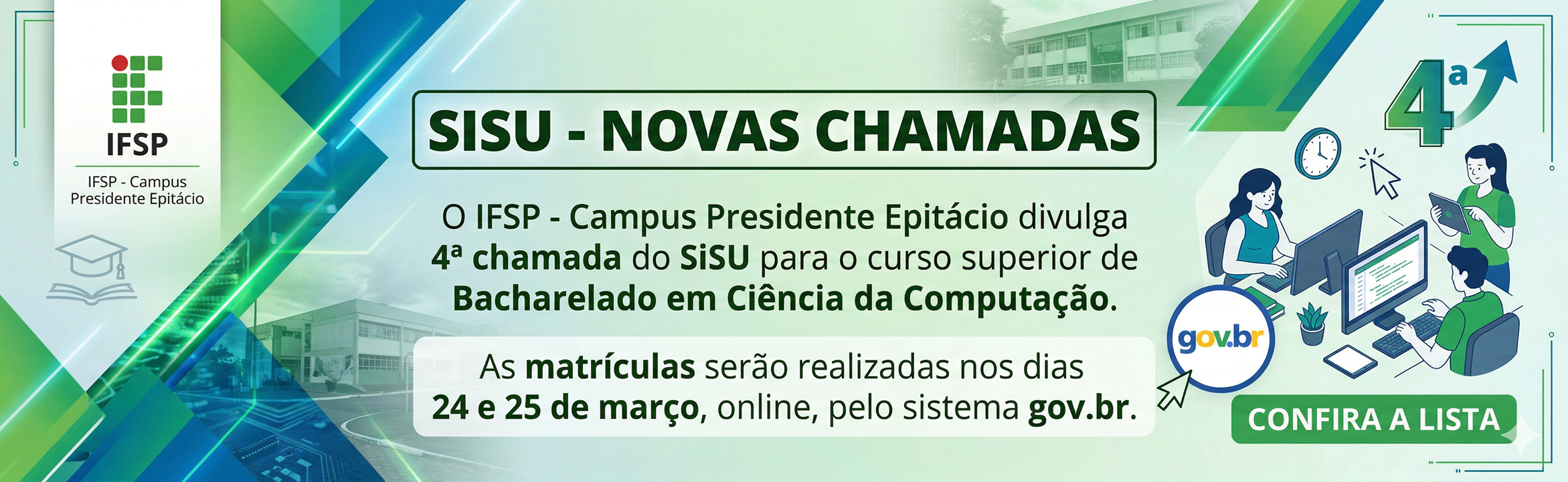 O IFSP - Campus Presidente Epitácio divulga 4ª chamada do SiSU para o curso superior de Bacharelado em Ciência da Computação.As matrículas serão realizadas nos dias 24 e 25 de março, online, pelo sistema gov.br.4ª CHAMADA PARA MATRÍCULA DO IFSP NO SISU 2026Consulte aqui as publicações...